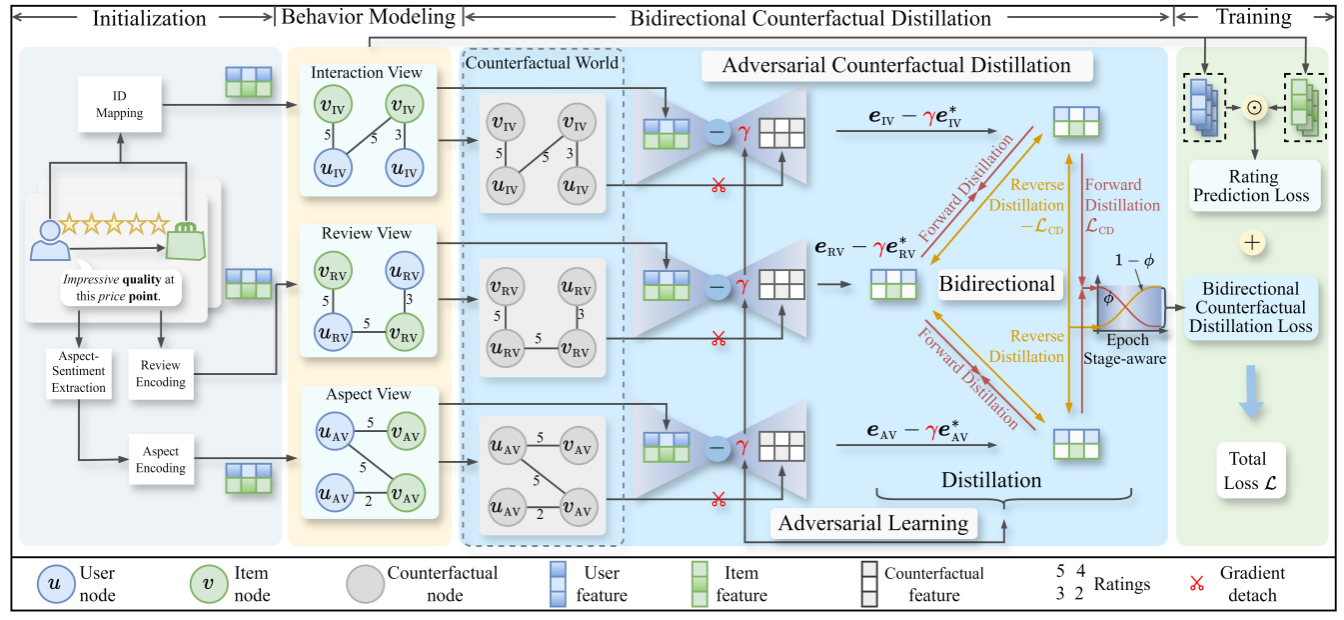 在推荐系统领域,博士生桑胜与课题组成员李书杰、李帅洋、刘康、李腾、贾伟、郭丹、薛峰(通讯)合作完成的论文《Bidirectional Counterfactual Distillation for Review-Based Recommendation》 被录用。该研究针对现有基于评论的推荐方法在跨行为知识传递过程中存在的评级分布偏差污染与特征同质化问题,提出了一种全新的双向反事实蒸馏框架,展现出卓越的去偏能力与跨行为知识共享性能。
