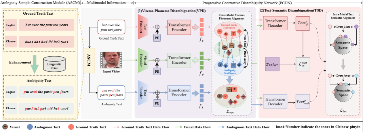 在视觉语音识别方向,薛峰教授与祝保朝、贾伟、李书杰、李雨、张津睿、唐申庚、郭丹合作的论文《LinProVSR: Linguistics-Knowledge Guided Progressive Disambiguation Network for Visual Speech Recognition》被录用。该研究针对视觉唇语识别中存在的音素模糊问题提出了一种基于语言学知识引导的渐进消歧网络,在多个公开数据集上均取得了显著性能提升,特别是在区分视觉上相似音素方面实现突破性进展。